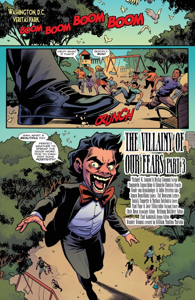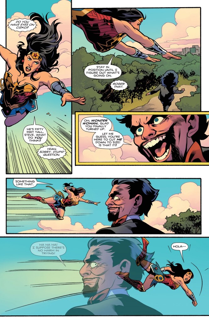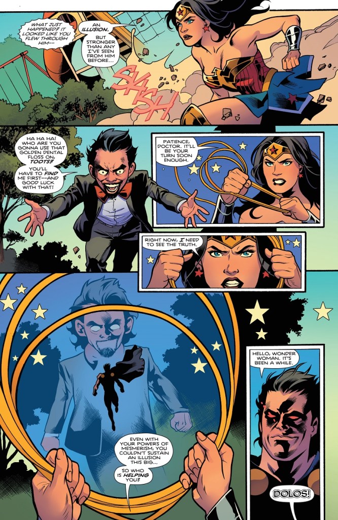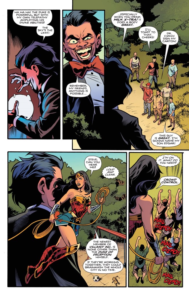 Man-ifest your future! Thanks to Cizko’s new catchphrase, he’s gained fans, and more importantly, soldiers in his war against Wonder Woman. But with Checkmate at our hero’s side, the depraved doctor will have to bring in big guns like…the Duke of Deception! Will this former agent of Ares prove too much for the Amazon Princess? Plus, a growing danger lurks on the island of Diana’s youth in our backup story!