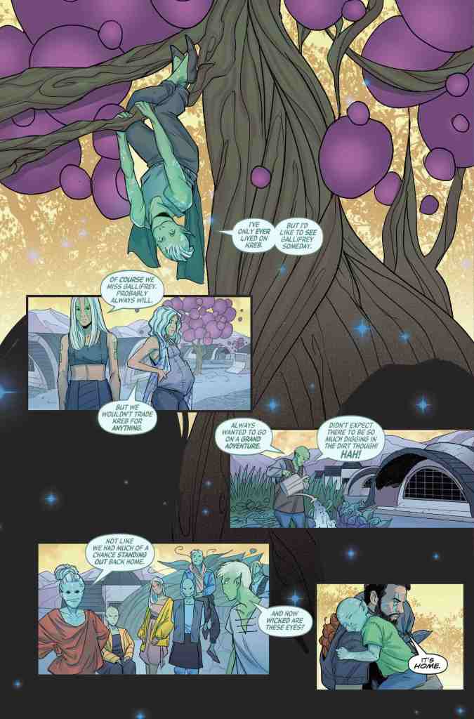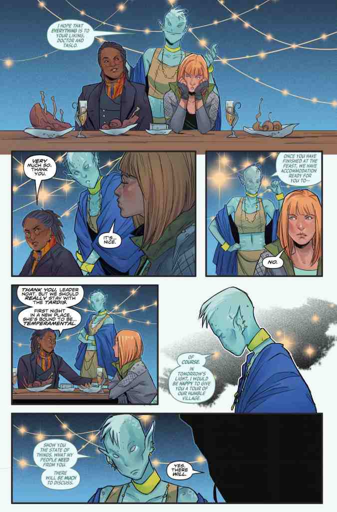 Arguably consisting of little more than a slow-paced tour of the planet Kreb, this twenty-page periodical’s pedestrian plot probably won’t land particularly well with those Whovians who like their leading protagonist to be a little more action-orientated. In fact, it’s difficult to imagine a less dynamic incarnation of the Gallifreyan than the one Jody Houser pens nonchalantly wandering around this comic’s friendly, extra-terrestrial settlement supping wine and eating cooked meat; “This is beautiful work. Was this planet the first location for your colony?”