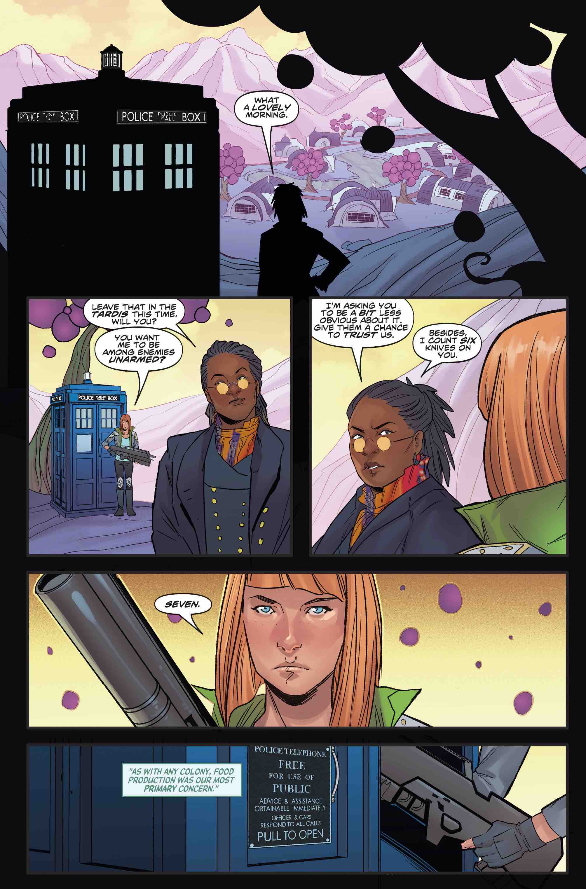 Of course, that isn’t to say that issue two of Doctor Who: Origins is entirely weighed down by a seemingly never-ending carousel of heavily-populated text balloons and insights into an alien farming culture – courtesy of the Fugitive Doctor’s latest travelling companion, Taslo. The Division’s newest, super-eager recruit is a constant reminder as to how aggressive the mysterious clandestine Time Lord agency apparently is during this period of Rassilon’s people, especially when she suddenly murders the unarmed Leader Noat with a cold-blooded knife blow from behind once the girl’s content no-one else can witness her lethal attack.