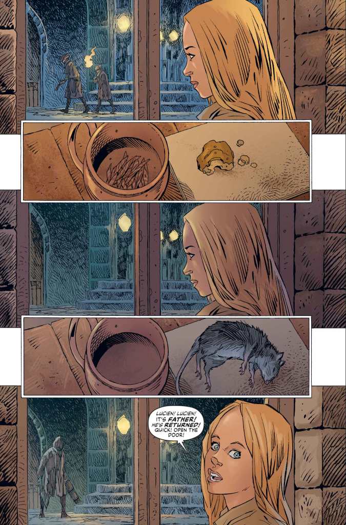 I absolutely love the pacing here, with the gradual ramping up of the tension between our two young siblings as they anxiously await the return of their father, who has foolishly ventured out on the night of The Hunt in search of food. Piotr Kowalski – who is himself something of a Bloodborne veteran, having illustrated all three volumes of Titan’s previous series’ – does a great job of bringing these moments to the page, and his depiction of the youngsters’ gradually diminishing food supplies (which you can feast your eyes on below) really helps to set the uncomfortable tone for the remainder of the issue.