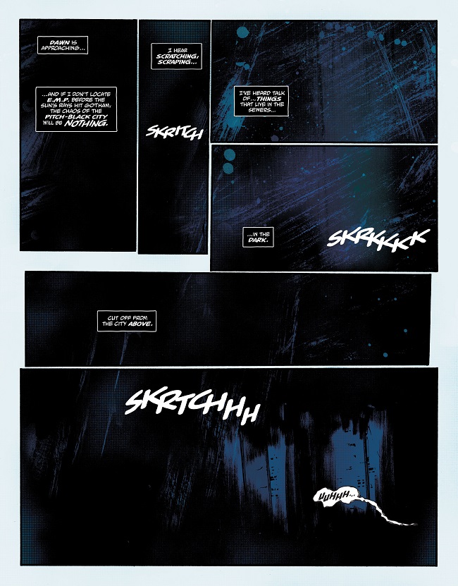 From the sewers under Gotham to the roiling waters of the harbor, Batman’s march toward Blackgate Prison is nearing its end…but far from being a passive prisoner, E.M.P. has his own mission to fulfill-and there’s no way he’s letting the Dark Knight stop him from carrying it out!