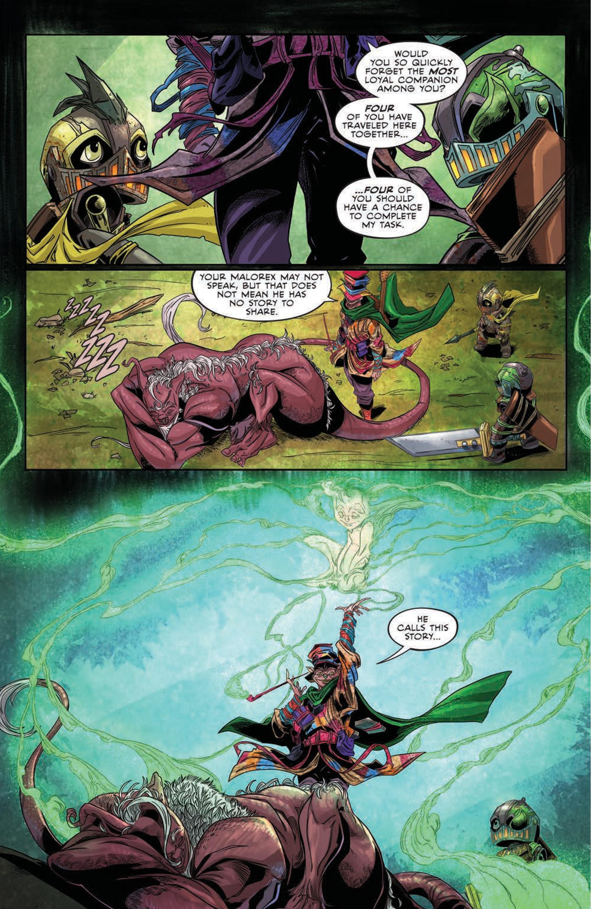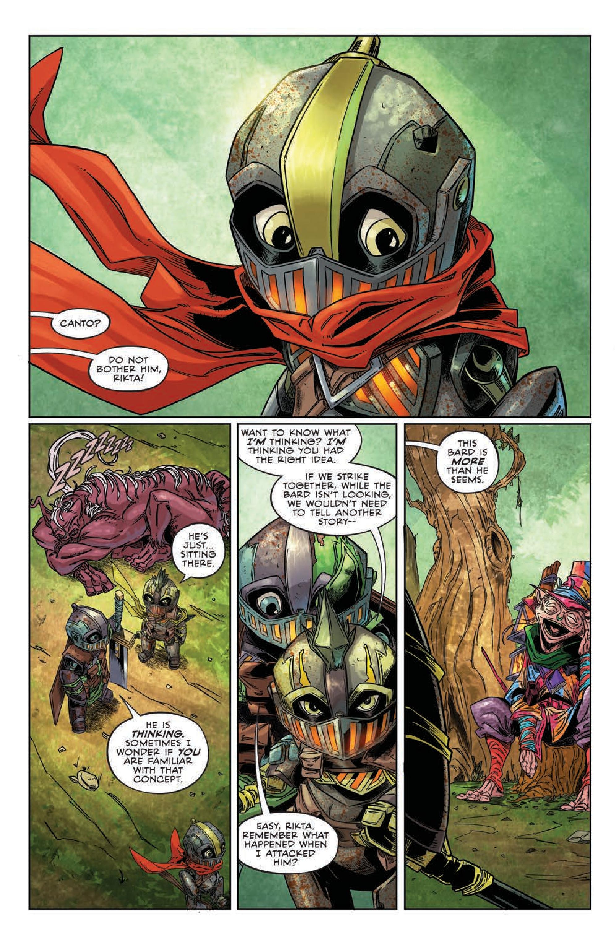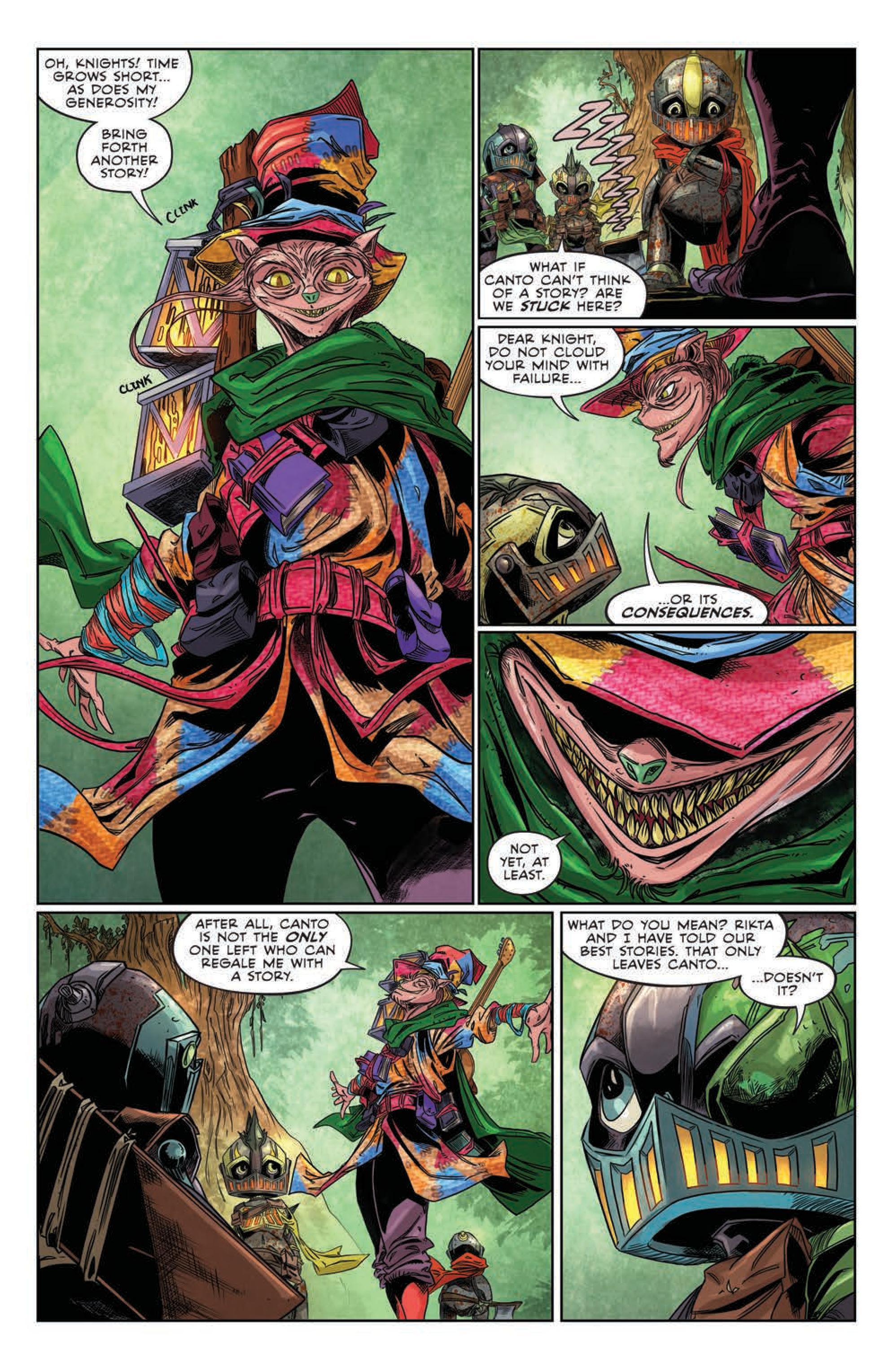 Canto, his fellow knights, and their trusty Malorex grow fretful as the mysterious and foreboding Bard continues to detain them, requiring a tale never before heard in order to earn passage. As they try to buy time, Canto digs deep to solve the Bard’s riddle, and uncover the true nature of this threatening creature, in order to return home safely from their quest.