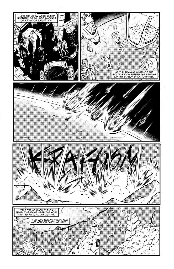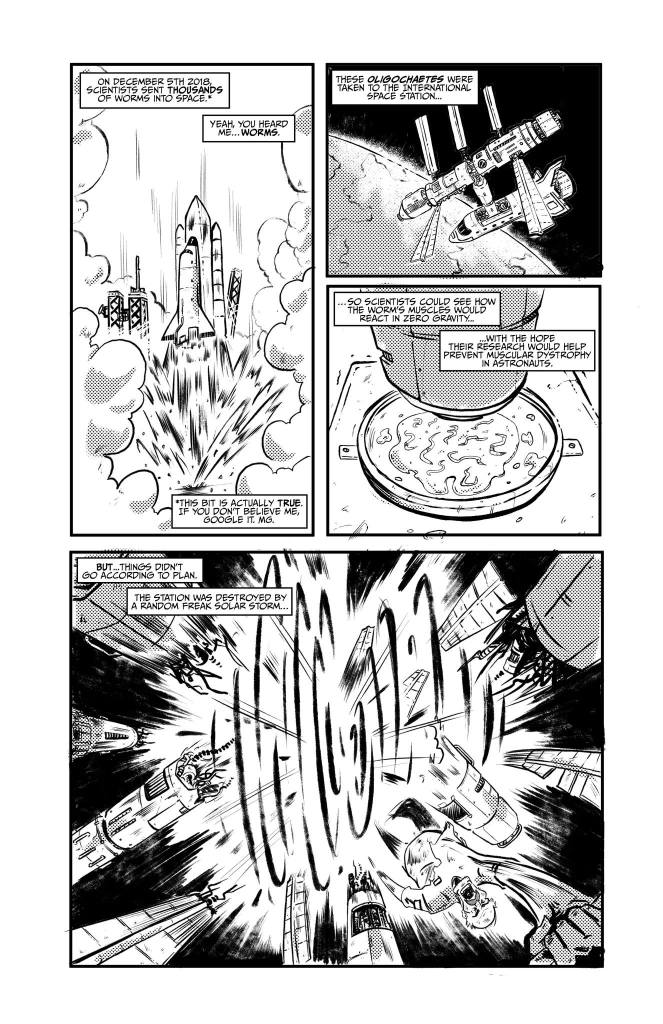 Entertainingly mixing science fiction with science fact courtesy of the storyline being based upon the true story of thousands of worms being sent up to “the international space station so they could see how a worm’s muscles would react in zero gravity”, this comic’s plot is arguably as insane as its title is eye-catchingly explicit. In fact, the sheer sense of unequivocable zany fun which emanates from issue one of Big F#@k Off Worms is so palpable that its readers will doubtless be able to easily imagine its creative team of Matt Garvey and J. Francis Totti guffawing away to themselves whilst they were producing the post-apocalyptic publication; “I say people because when the worms returned, the radiation they brought with them mutated every human being on the planet into an… antha… anthro-promo… it mutated them into human/animal hybrids.”
