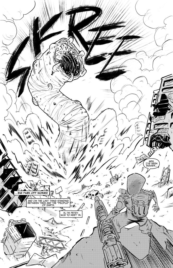 Similarly as successful though is the sense of endearing incompetence Garvey imbues “the last thing standing” with. This idiocy starts straight from the get-go, with Totti prodigiously pencilling Petey blazing away at the supposedly small(ish) worm he’s currently facing, only to discover that he’s so far away from the gigantic monstrosity that his bullets impotently land on the sun-scorched ground long before they reach their target. Such a laugh-out-loud moment is delightfully rather typical of the protagonist’s persistent attempts to fell his foe, and even when he does eventually succeed in killing the small-brained crawler the buffoon forgets that the enormous lifeless corpse will now fall slap down on top of him as a result of gravity.