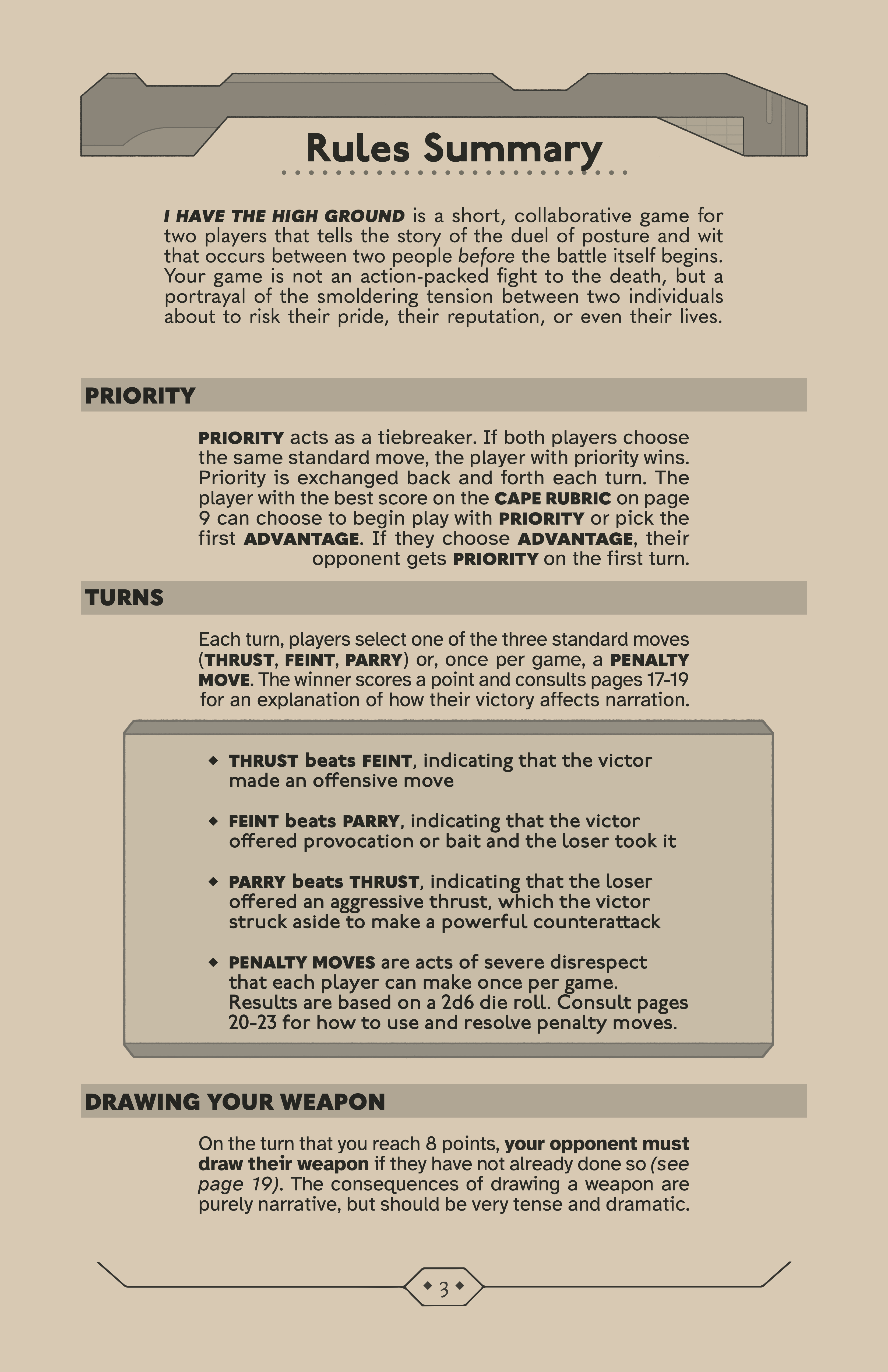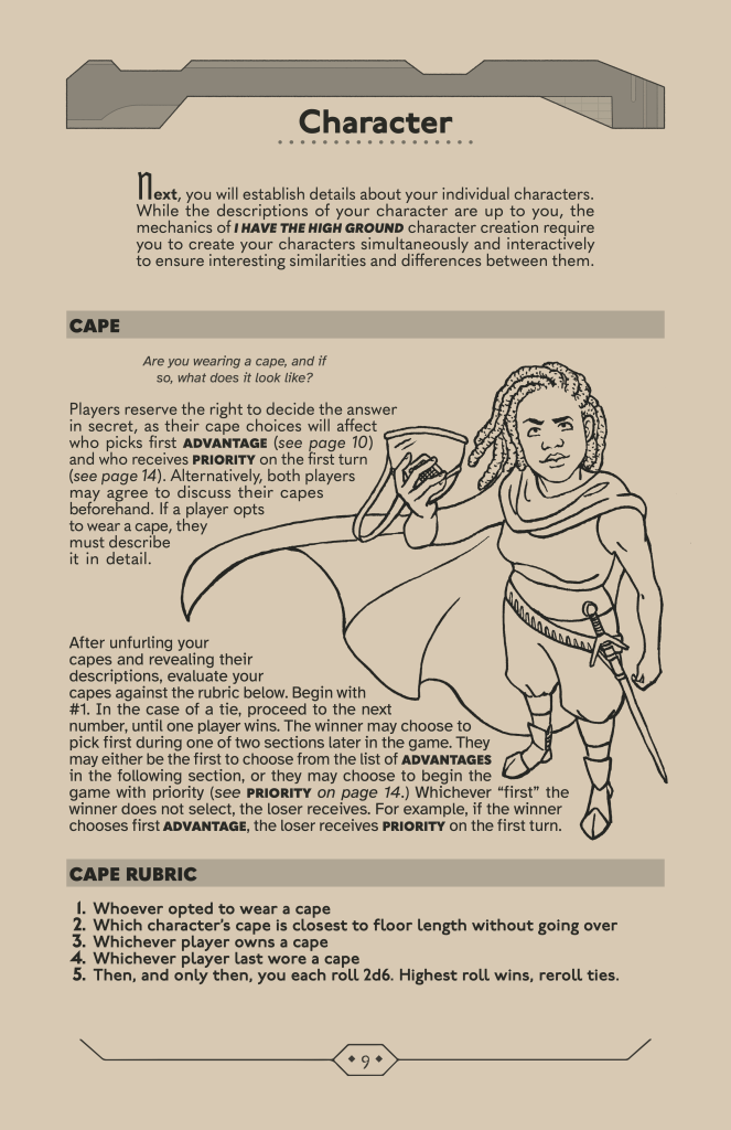You’ll also need to decide on characters. A memorable duel doesn’t involve two John or Jane Does. A memorable duel is one where we have an inkling to a character’s motives, history, and a good idea of their cape; yes cape. As part of the set up and determining priority I have the High Ground uses a novel idea of the description of one’s cape being used. This is actually a lot simpler than it appears and I think could lead to some fun conversations between players. Without wanting to jump into hacking this at the get go, it would be really easy to alter this slightly to cover any piece of clothing or maybe even the player’s weapon itself if you are really cape averse.
