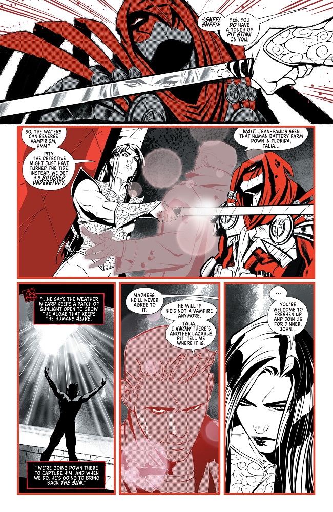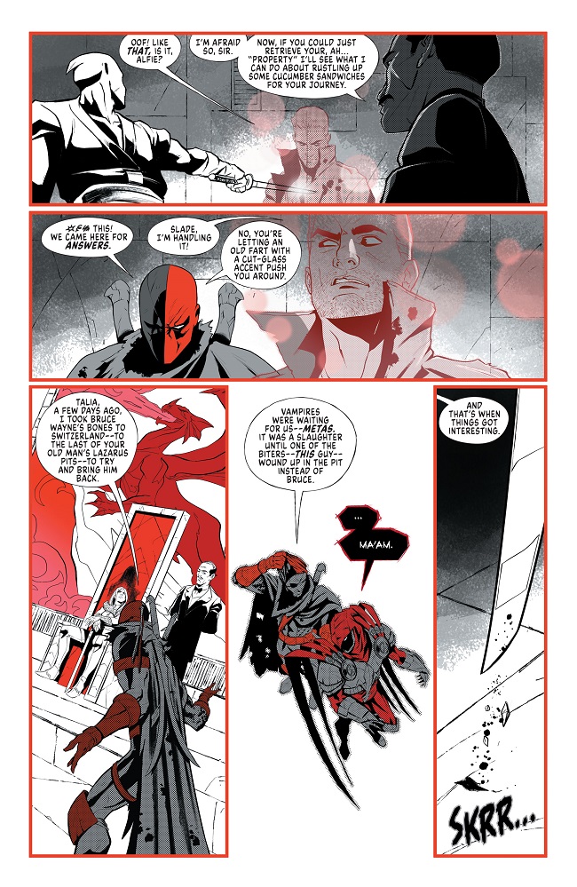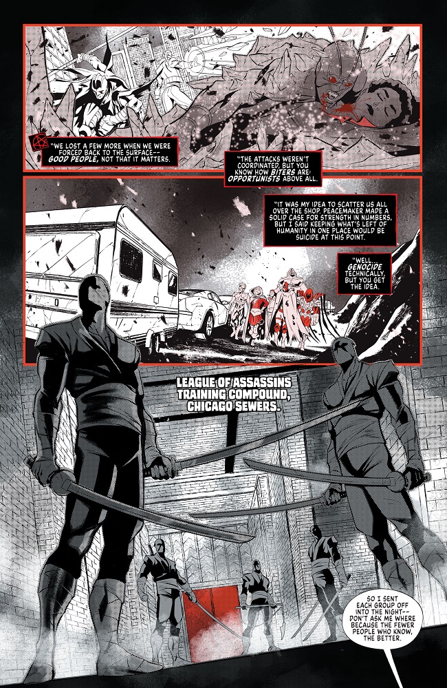 The survivors of a horrifying vampire attack, led by Deathstroke, take shelter with Talia al Ghul. With intel from a hero recently saved from vampirism, John Constantine prepares them for a (suicide) mission, while Midnighter goes through every scenario in his head and finds out the dark truth. Meanwhile the mysterious vampire Lord Cinder has become aware of their plans and prepares a surprise…