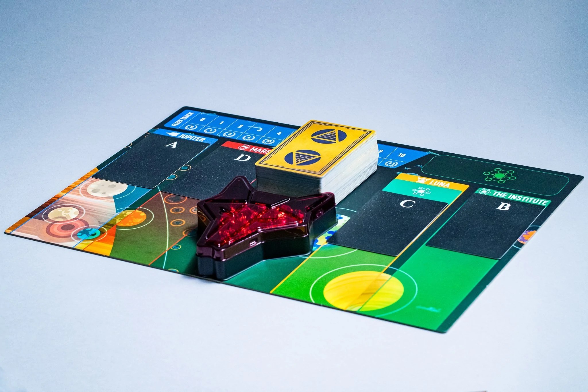 This is a fierce and devious game of building the best final hand by the time the endgame triggers. Cards are in coloured suits that represent the different strata of society, though you’re not necessarily set collecting. You’re initially competing for advancement in your (space) Fleet or the Institute (the training ground of the Elite). And whilst these will give you a measure of victory at the end it’s the combination you have built that will ultimately determine your success.