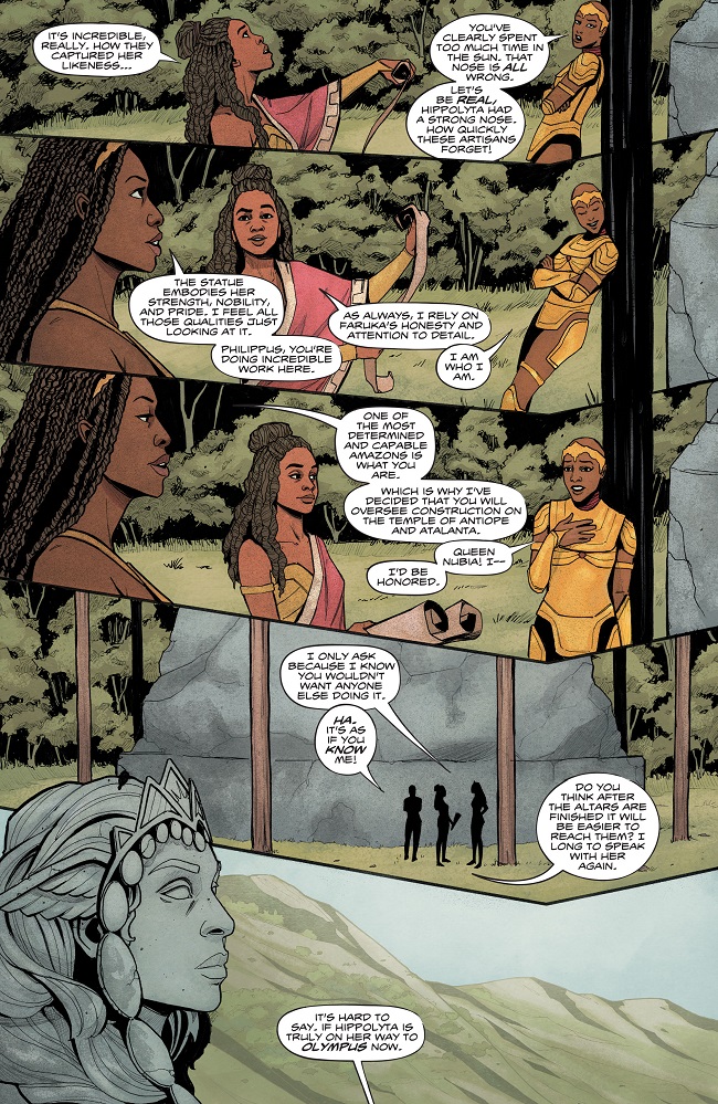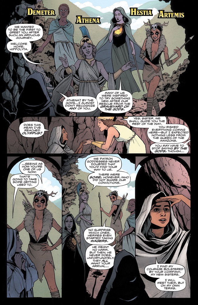 After years of bitter and violent conflict, the Greek pantheon of gods stands united to welcome their latest goddess…Hippolyta of Themyscira! Due to her heroic efforts in the mortal realm, the former queen has earned her rightful place among the gods and plans to use her newfound powers to take care of her Amazon sisters from beyond. Little does she know, some of the gods are wary of the new future Hippolyta brings and will do just about anything to stop it!