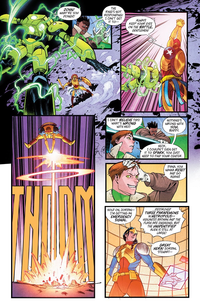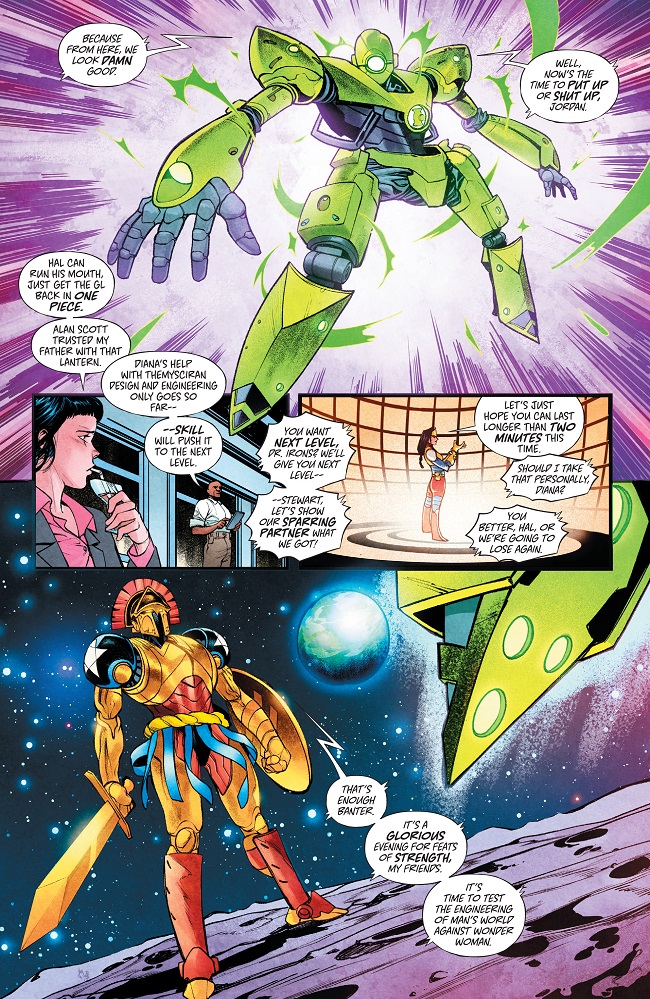 Wonder Woman’s war machine! Wonder Woman and the Green Lanterns have arrived to help Batman and the Flash stop the invader from the stars known as Superman. The last time mechs from space arrived, they tried to destroy Earth—these heroes won’t let that happen again, despite Superman’s protests that he’s on their side. Hawkwoman, the war mother of Earth, will intervene to prove to Earth’s heroes Superman is on their side as Darkseid and Lex Luthor prepare their next moves in response to Superman’s arrival…