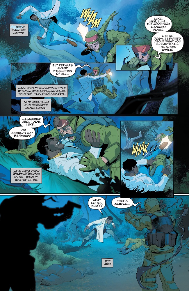 Nuke it from orbit…is what we shoulda done to this whole entire moon. Who needs a moon anyway? I blame Luke Fox for sending a team of villains into space to fight a horrific alien monster in the first place. Obviously, that was just never going to work out well. Has Luke ever seen a sci-fi movie? And now you’re expectin’ me to save Earth with just my super-awesome-mallet-ofalien- skull-crashing-madness™? Okay, you asked for it…