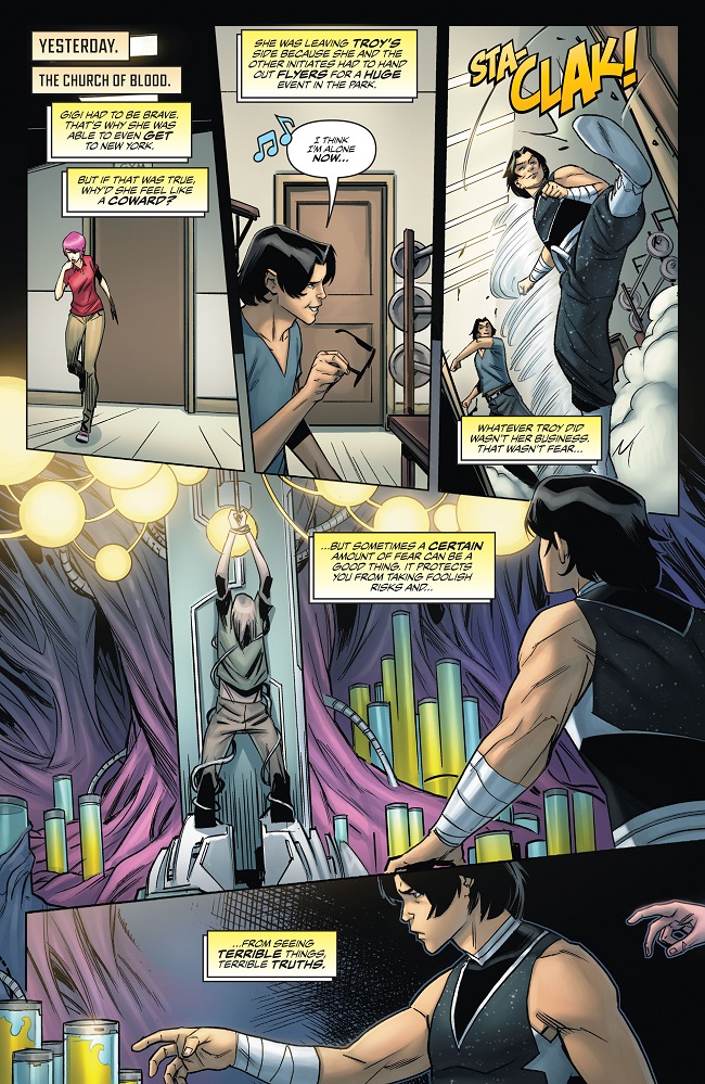 An action-packed issue finds Kid Quick and their allies on Earth-11 face-to-face with a worlds-shaking threat! At last…why Raven refuses to join the team! Will the revelation prevent a tragedy…or somehow make it worse? Plus: an unexpected ally helps Troy escape the Church of Blood, the reunion the team’s been hoping for finally takes place, and the villainy of the Core comes to light! On a scale of 1 to 10 for surprises and all-around awesomeness, this one’s a solid (Earth-) 11!