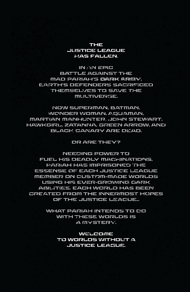 When Pariah and his forces of the Great Darkness laid waste to the most powerful superheroes of all time, all hope was lost…until now. To power his weapons of war, Pariah has captured each member of the Justice League and trapped them on worlds suited to their every dream and desire…while the planets themselves slowly eat away at their respective inhabitants.