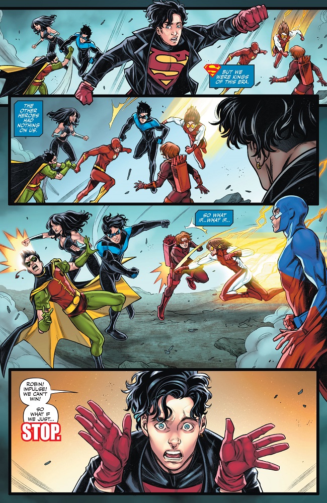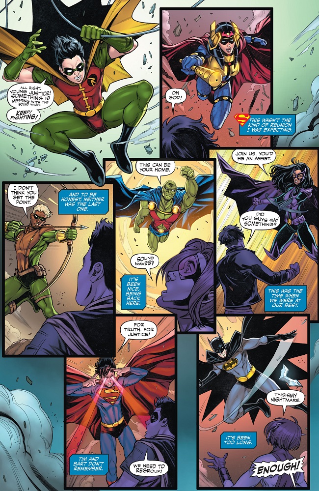 Young Justice against the world! The fake reality that Superboy, Impulse, and Robin are trapped in has completely turned against them, sending the full force of the JLA and the Titans they grew up with against them. It will take all of their combined might to fight through this onslaught and find out who is responsible for their imprisonment.