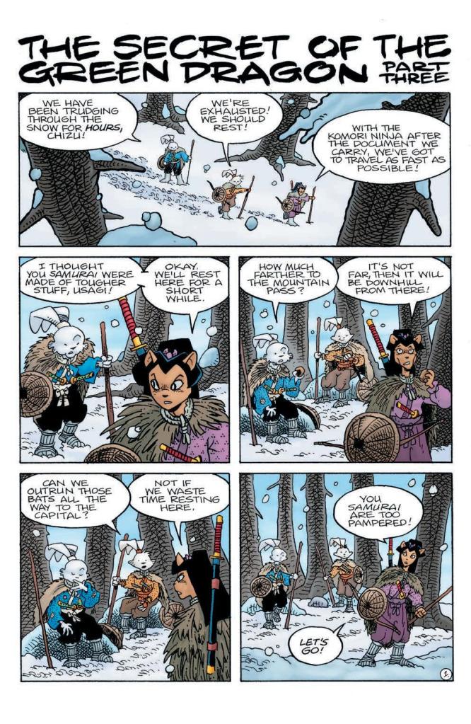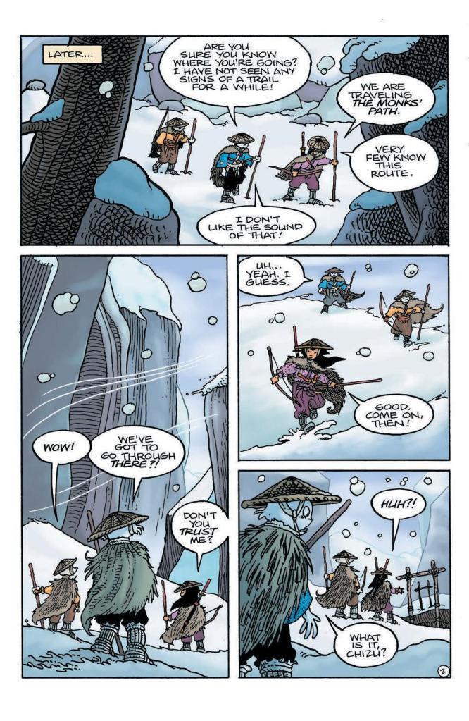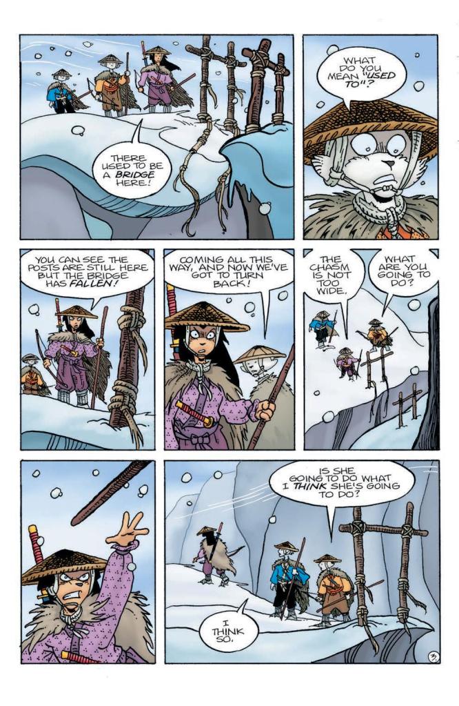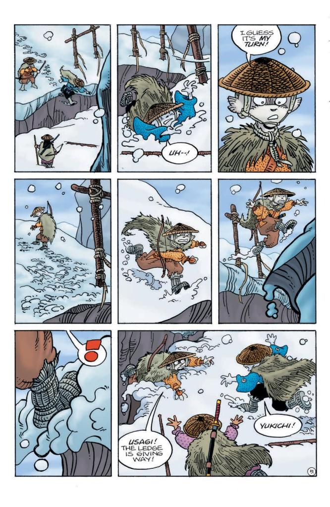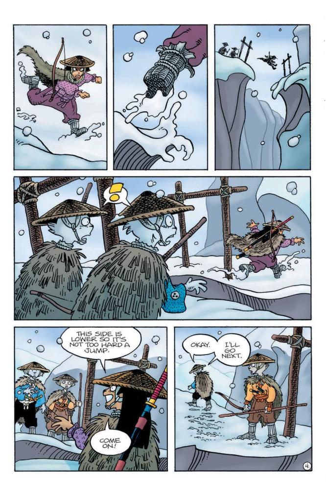 With the Komori (Bat) Ninja Clan behind them, Usagi, Yukichi, and Chizu flee over the snow-covered pass. They have to cross a frozen lake, but their position in the open on such a slippery surface makes them easy prey for the bats-and the ice is not completely frozen! Also, Yukichi learns a valuable lesson: you can’t trust a ninja.