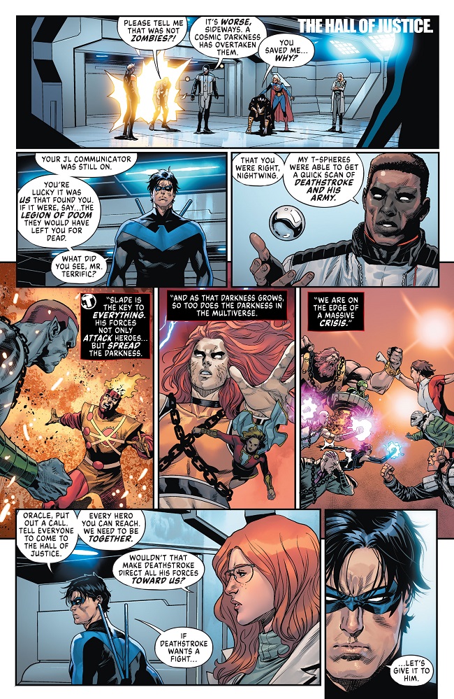 After the shocking events of the last issue, Pariah has won. And now his Dark Army is poised for the invasion of our world. It’s up to the Titans to rally the remaining heroes to defeat Deathstroke’s ever-growing forces and avert total destruction! An epic war starts on the steps of the Hall of Justice, and only a miracle could help the heroes now.