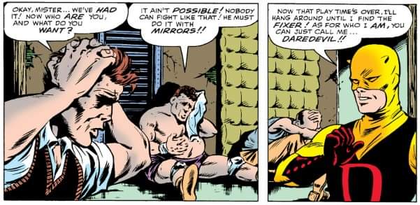 The origin of his moniker was another interesting tidbit to learn about. I assumed he was called Daredevil because of his reckless aerobatics. As it turns out, the children (high schoolers?) teased Matt for always prioritizing his studies over playing with the other kids. One says, “… Be sure you don’t tire yourself out turning all those heavy pages in your school book!”