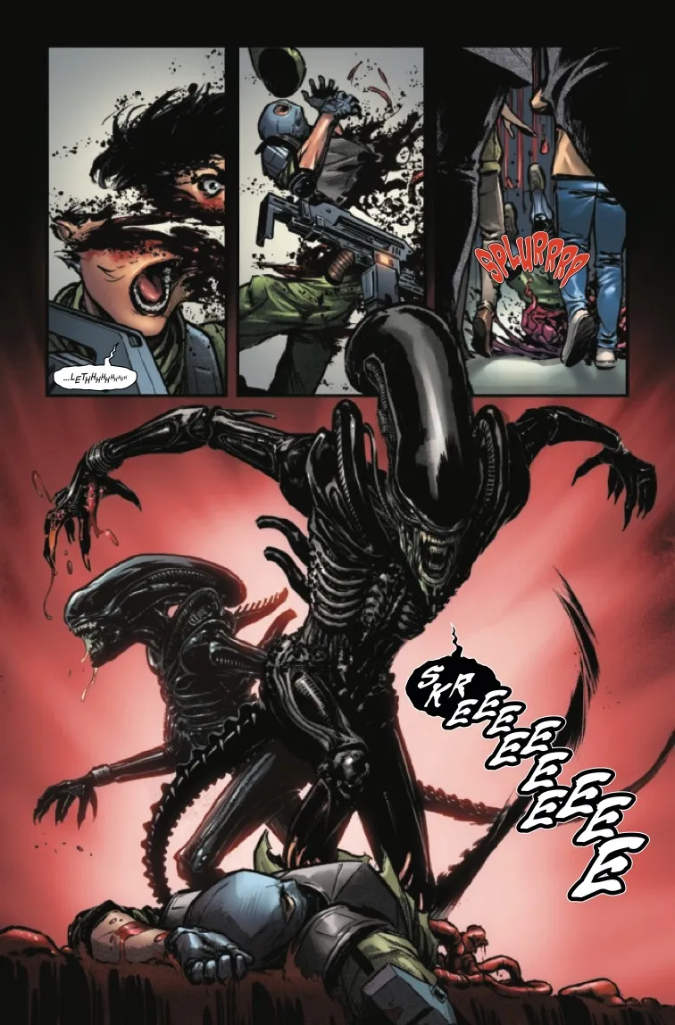 Cleverly chucking a bucketful of gore over this twenty-page periodical’s penned proceedings is artist Julius Ohta, whose ability to prodigiously pencil a person or two being horrifically eviscerated by a deadly Xenomorph clearly knows no bounds. The Brazilian illustrator also does a good job of imbuing the various synthetics with some notable individualism, such as Freyja’s evident air of authority over Nora, Seth and Astrid, as well as Eli’s obvious displeasure at having to leave “some of them alive for interrogation.”