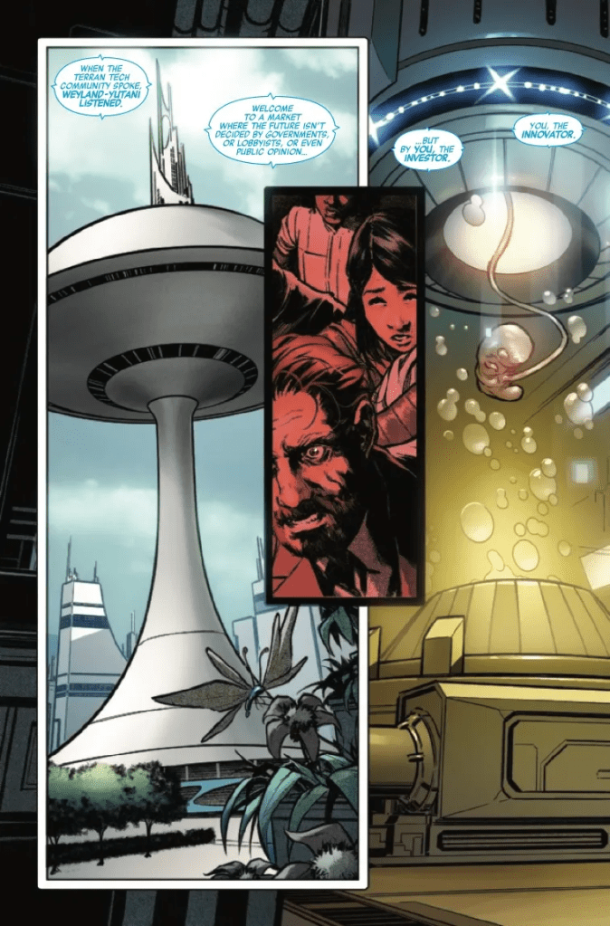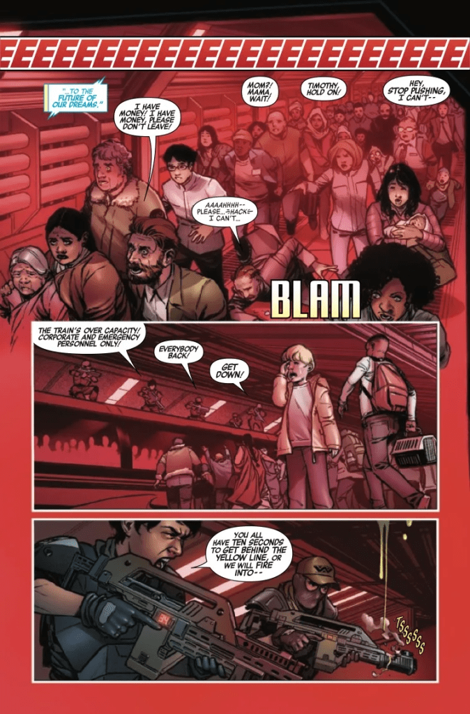 Beginning with a truly terrifying insight into the opening hours of a Xenomorph outbreak on the supposedly idyllic planet Tobler-9, Phillip Kennedy Johnson’s script for this re-launched “express elevator to Hell” definitely will hold its readers’ attention for the comic’s first few pages. However, once the spotlight moves away from the old Weyland-Yutani red site and the palpable terror of its residents as they desperately attempt to board the metropolis’ last turbo-train, this first issue arguably becomes a bit too contrived for its own good; “Congress practically begged me to reinstate the Synth teams, starting with you. One last mission.”