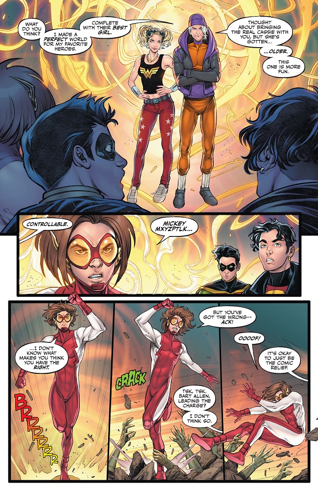 HERE’S MICKEY! Mickey Mxyzptlk, son of Mr. Mxyzptlk, built the “perfect world” where he and the boys of Young Justice could rule without being criticized, without having to change, without ever having to grow up. Mickey has an ugly soul and too much power. The boys of Young Justice will have to overcome their shortcomings and defeat him to get back to the DCU they know and need!