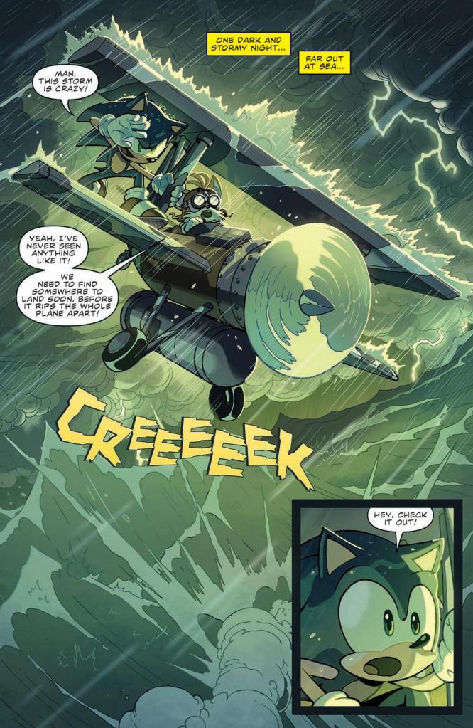 It was a dark and stormy night. Harsh rain from an unnatural storm fell upon Sonic the Hedgehog and Miles “Tails” Prower as they flew above the sea in the Tornado. Lightning strikes, causing the plane to spiral downward into a crash landing on an uncharted island.