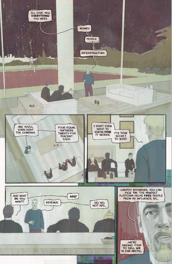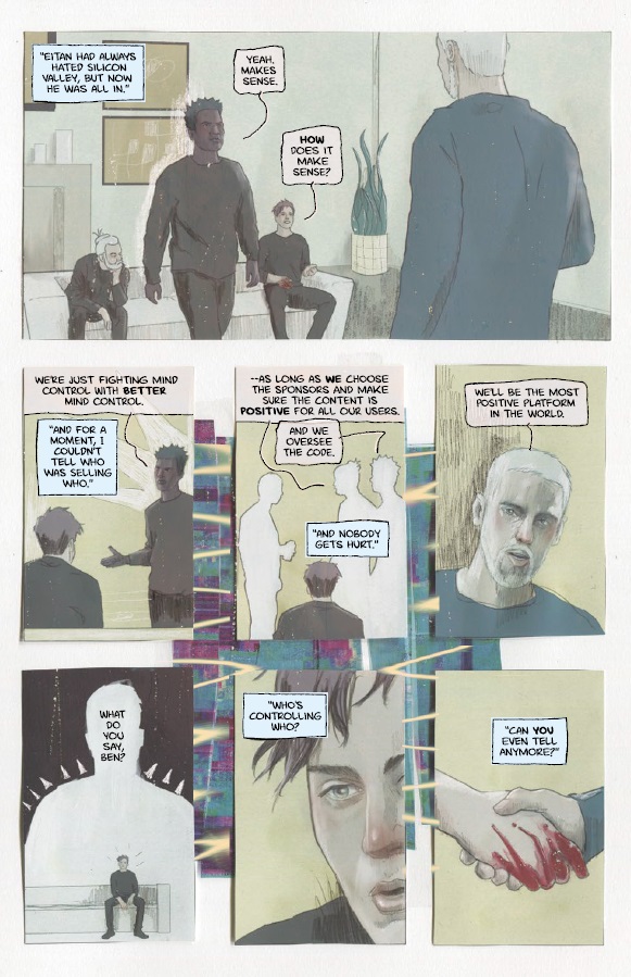 At the end of the previous issue, our quartet’s attempt to avoid the blackmail of tech billionaire Peter Winfield by stealing his phone and locking him into a “loop” of mind control ended in tragedy when one of the four, Kushal, was shot and killed by Winfield’s security. However, as with the final pages of the last chapter, Ben’s narration for this latest issue completely fails to acknowledge these events, instead believing fully that their plan was executed to perfection.