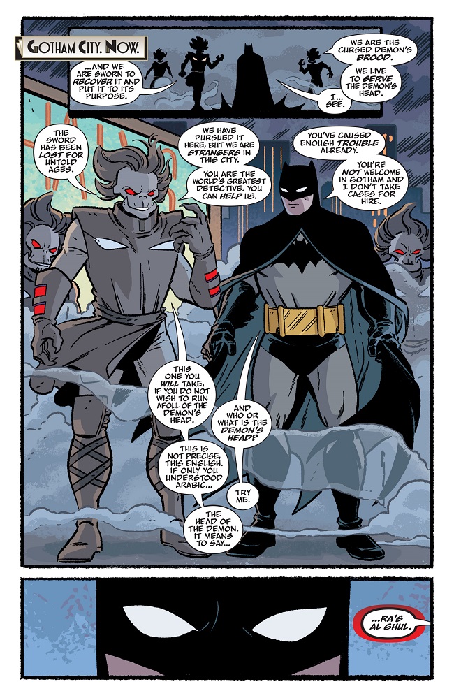 Batman comes face-to-face with the ninjas who have been tearing through the Gotham underworld. As the Dark Knight stares down the menacing assailants, he learns more about their mission as well as the name of the one they serve: the Demon’s Head, Ra’s al Ghul. Meanwhile, something prowls the sewers of Gotham City, a being whose mind has been warped by The Joker’s dark purple dawn!