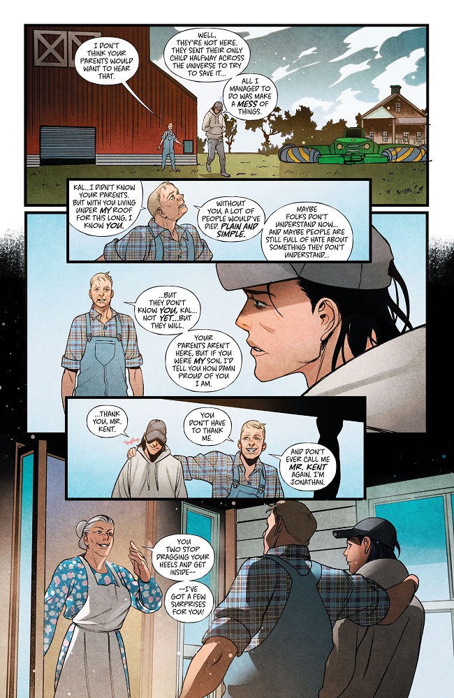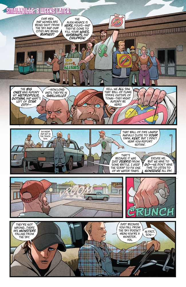 Darkseid’s forces defeated the Justice Squadron and killedsomeone near and dear to them. The heroes will have to fix their mechs and their team morale in order to get back in the fight. But Superman is hiding in a town called Smallville, living with a family called the Kents while trying to fix his mech. He’s in grave danger, as the people of Smallville don’t take kindly to mechs or aliens…