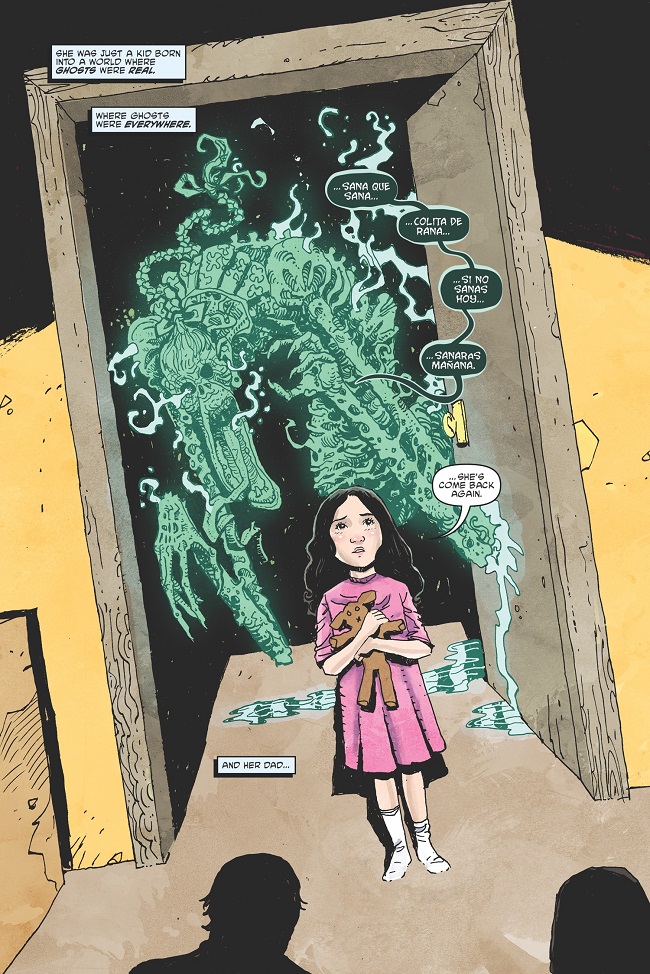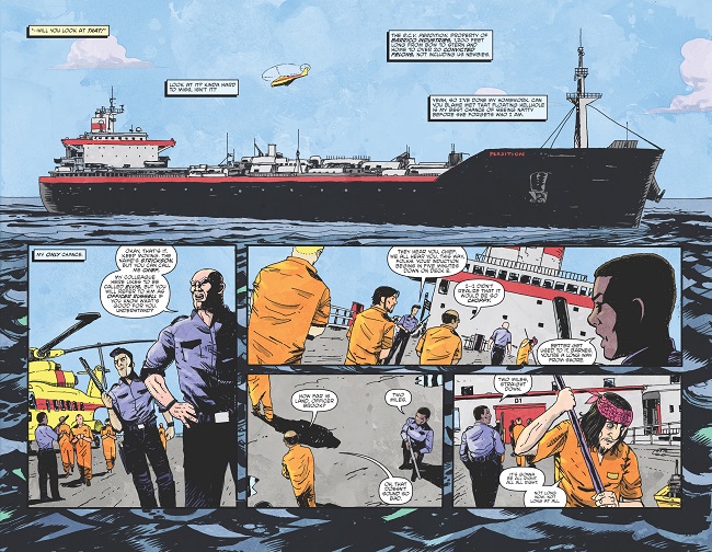 In Dead Seas, on sale next month from IDW Publishing as part of their new ‘IDW Original’ creator-owned imprint, humanity has decided to solve this particular problem by using convicted felons to harvest the ectoplasm in return for a reduced sentence. Our protagonist, Gus Ortiz, is part of the latest intake of prisoners who find themselves helicoptered onto to the floating prison camp Perdition and set to work. However, as you might expect, things almost immediately go to hell, trapping Gus on board with some of the most vicious ghosts on the planet.