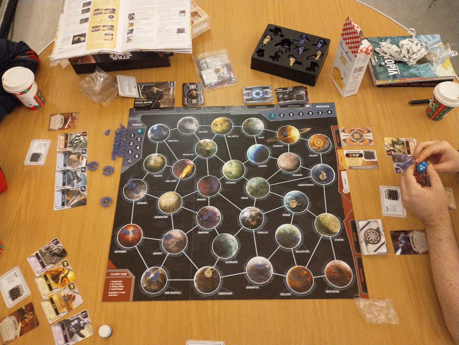 Your missions are the key here: go to planets, clear out droids, but also complete a specific goal; these missions require to use Scout cards from your hand, which feels much like standard Pandemic EXCEPT your cards act as your Hit Points also, so there’s a balance to be struck which is really interesting.