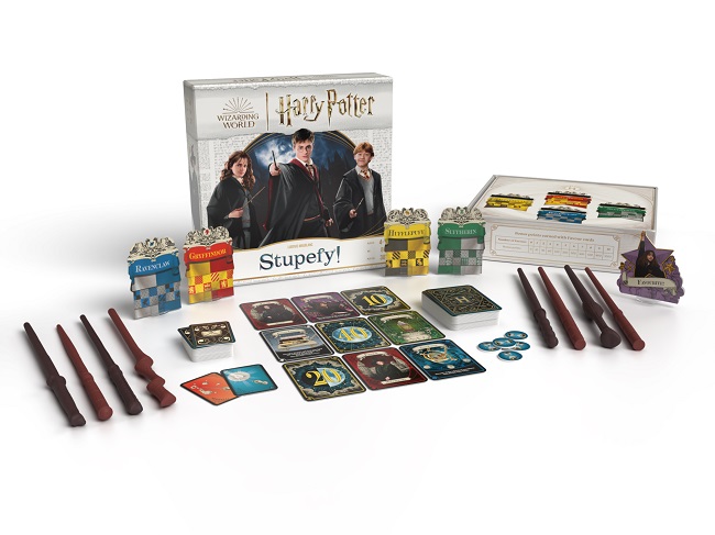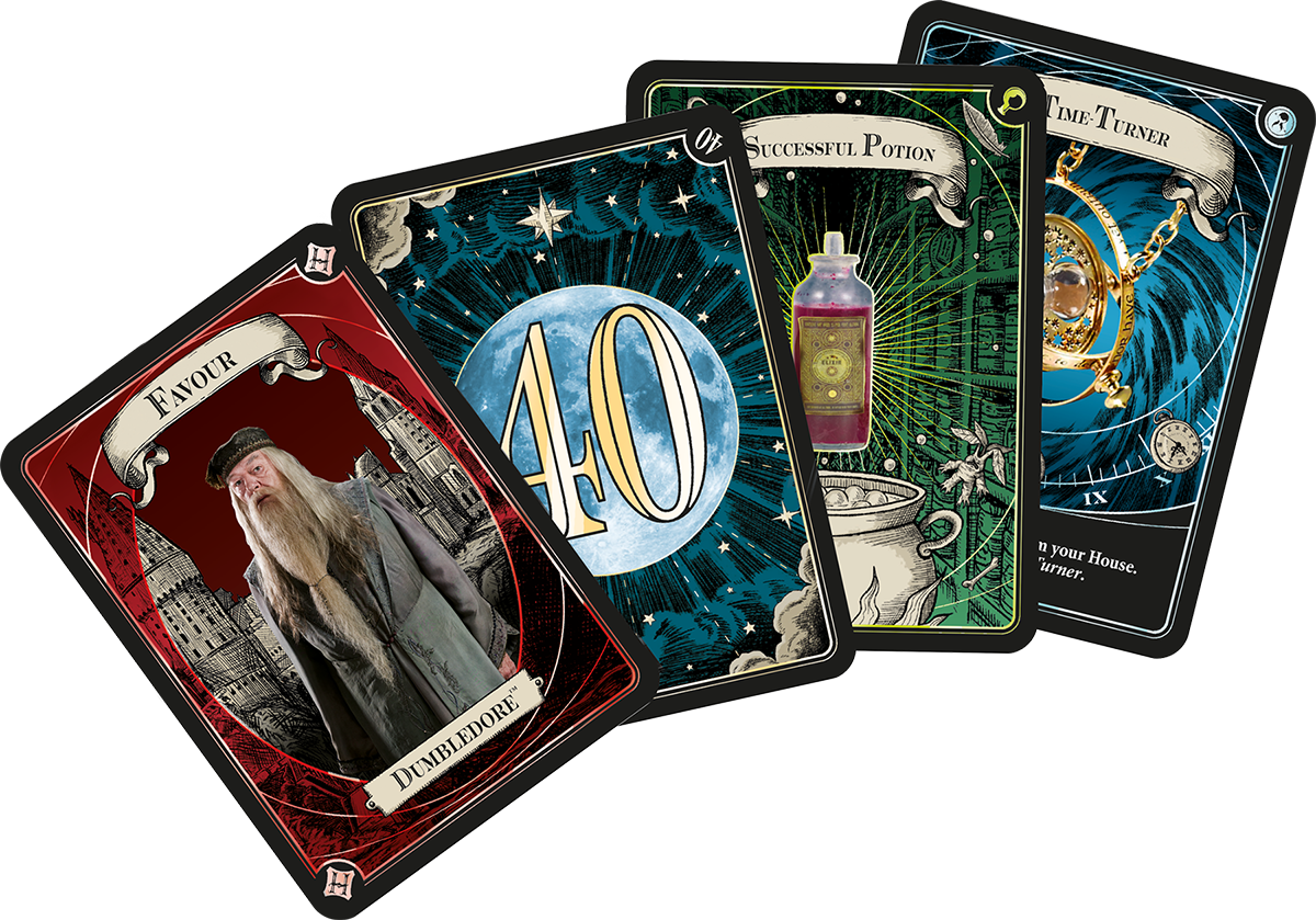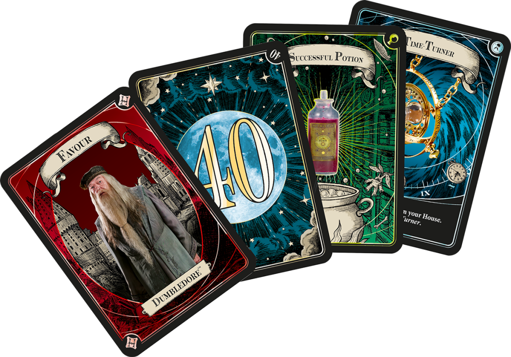 This Potter party game, for 4 to 8 players, has you casting a spells over the course of 8 rounds to win points for the house cup. You have a hand of cards, a mix of Stupefy! and Misspells (young wizards haven’t quite mastered the art of Duelling, you see). You choose one, and everyone points their wands at the same time; you either play the card (Stupefying an opponent, or Misspelling) or may choose to put up your wand and protect yourself with Protego (which effectively puts you out). If you survived the turn, you draw from the rewards which include new lessons (so you are less likely to Misspell), potions, Favours, bonus House points and even a Time-Turner! At the end of the 8th round, the house with most points wins.