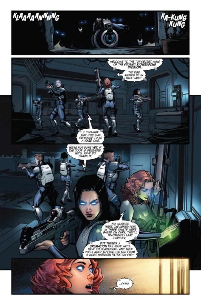 Frustratingly, much of this lack of threat is due to the Eisner-nominated writer’s build-up in which he pens the “legendary, unkillable Synthetic Special Operations team” as being so incredibly formidable that nothing organic ever tangled with them and walked away. Coupled with the quintet’s evident super-human abilities to ‘jump tall buildings with a single bound’, converse with one another ‘telepathically’ over a silent network and later, even rip-off the head of the alien infestation’s ruling sovereign with their bare hands, and it’s debatably difficult to believe anything this side of a nuclear bombardment will actually threaten Steel Team in any permanent way.