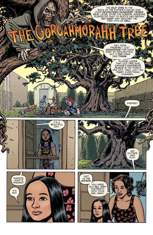 Likewise, David Lapham’s artwork is arguably a little too clean to successfully conjure up the increasingly dark atmosphere this ten-page tale needs to generate. The American cartoonist can clearly proficiently pencil a story, yet with the exception of the gnarly titular antagonist, everything else is rather stiff-looking – even when Daphne is busy chopping her neighbours into “tiny bits” with an axe so she can use their “mush” as fertilizer.
