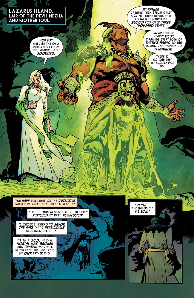 As the final battle erupts between Batman and Robin at the heart of Lazarus Island, a strange tremor rocks the combatants to their senses…This isn’t an island at all—it’s a volcano! With the Devil Nezha pulling the strings and unbelievable transformative power about to explode out into the world, our heroes have no choice but to do the unthinkable—fall back! A battle between father and son goes global as the Earth enters into the Lazarus Planet…