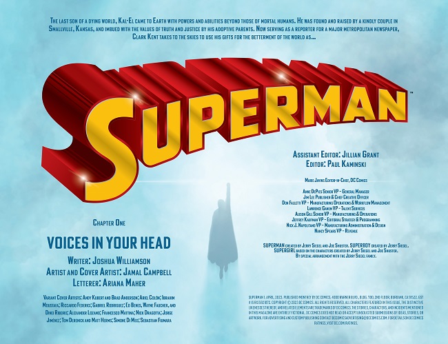 Superman has returned to Metropolis and his greatest enemy Lex Luthor is finally behind bars. The future of the Superman family has never been brighter! As Clark Kent settles back into his life, iconic and new enemies erupt from the shadows to strike down the Man of Steel! But waiting in the wings to back up Big Blue is…Supercorp?! What secret project has Lex given to Superman?! “A hero is only as good as their villains” will be put to the test in this brand-new oversize #1 featuring comics’ greatest superhero by DC Comics architect Joshua Williamson and award-winning superstar artist Jamal Campbell!
