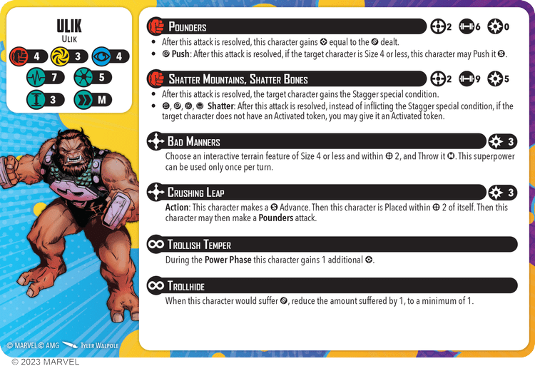 Ulik, meanwhile, is 5 cost and he hits like a sack of bricks, or should I say rocks, with a whopping native strength 6 attack. Typically you’d expect characters on this scale to be slow but his crushing leap lets him move S+R2 into that for 3 power. Like other entities from the Asgardian mythos, he’s generating an extra power per turn, and his Str 9 attack, although 5 power, activates the target most of time (if they’re not down already). This is a great ability, and means that – like Beta-Ray Bill – you’re going to be taking the fight to your opponent’s biggest hitters – let’s face it, str 9 is going to be a bit redundant against smaller foes. I’m not entirely sold on him at 5, though: I still lean towards Juggernaut, even though that extra power generation is mighty tempting.