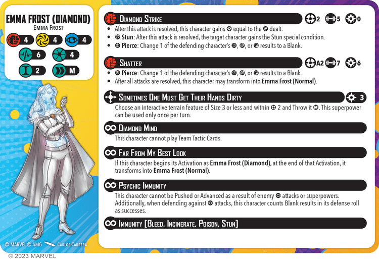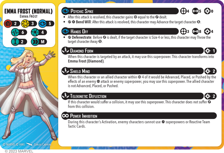 I am very excited to see Emma as White Queen on the table, leading the new Hellfire Club faction, though at 4 cost she’s still a totally viable choice in any mutant list; just her basic power builder is a Psychic 5str R4 attack that moves the target S on wilds and crits.