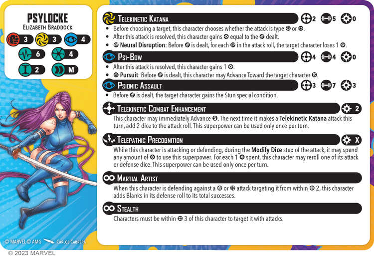 Psylocke is a vicious, versatile killing machine, pure and simple. With two power builders and masses of rerolls (both from Martial Artist and Telekinetic Combat Enhancement), Stealth AND lots of ways to get extra S moves, she’s nimble and utterly lethal – and that’s before we talk about her R3 Str7 stunning attack. Really feels like the character, and she’s pretty much an auto-include even at 4 points for X-Men lists at that point. I’m less sure she’ll see play out of faction at that price, but I’m certainly looking forward to having her on my side of the table.