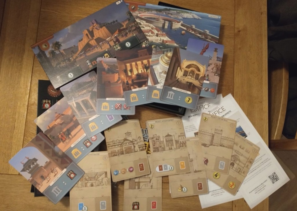 7 Wonders Edifice treads a fine line by introducing shared goals, complete with wonderful Edifice tokens for each age, which you can build together as you would a Wonder (though if playing with 7 Wonders: Armada, incidentally, you can only build one or the other per age) If you don’t join in, and the building doesn’t get constructed, you also incur a penalty. In each age, a random Edifice is placed project side up on the table, with a marker for each player. Once the last marker is flipped, each player gains the reward, or suffer the penalty if you haven’t joined in – which can even include going into debt! The expansion also includes two new wonders: Ur specifically interacts with Edifices whilst Carthage is generic.