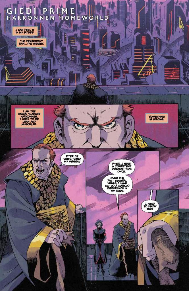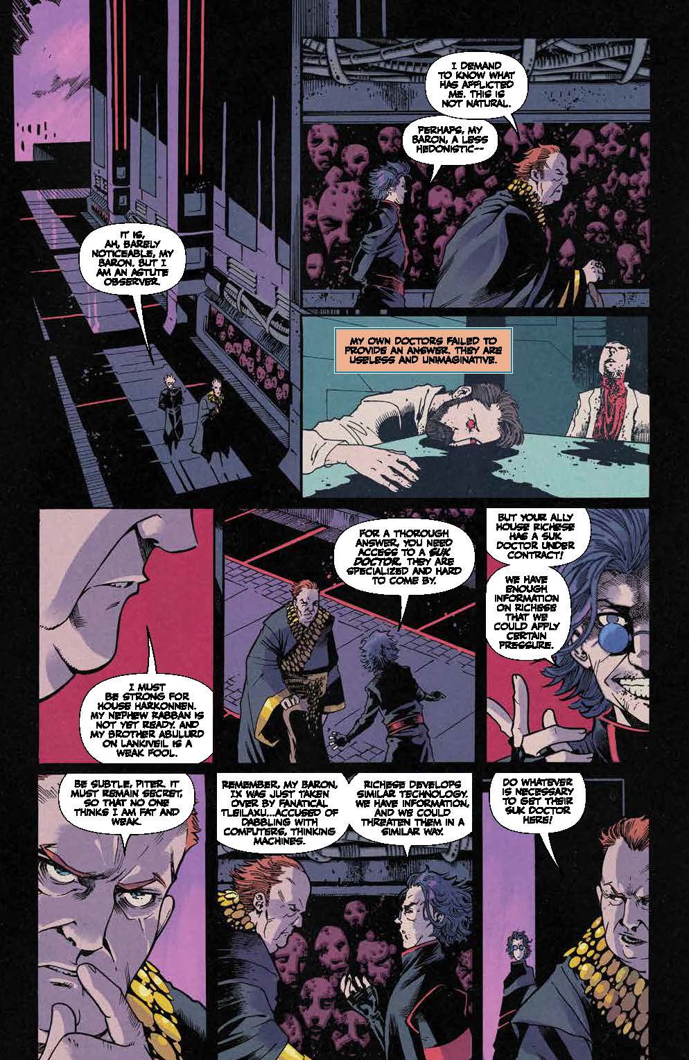 Arguably this comic’s biggest draw though comes with Vladimir Harkonnen’s discovery that his increasing weight gain and physical lethargy stems from him being poisoned by the Reverend Mother Gaius Helen Mohiam. The tense atmosphere during the Baron’s examination by a Suk Doctor of the Inner Circle can be cut with a knife, and the planetary governor’s angry reaction to learning the Bene Gesserit has infected him with “an incurable degenerative disease” definitely does not bode well for the future Imperial Truthsayer.