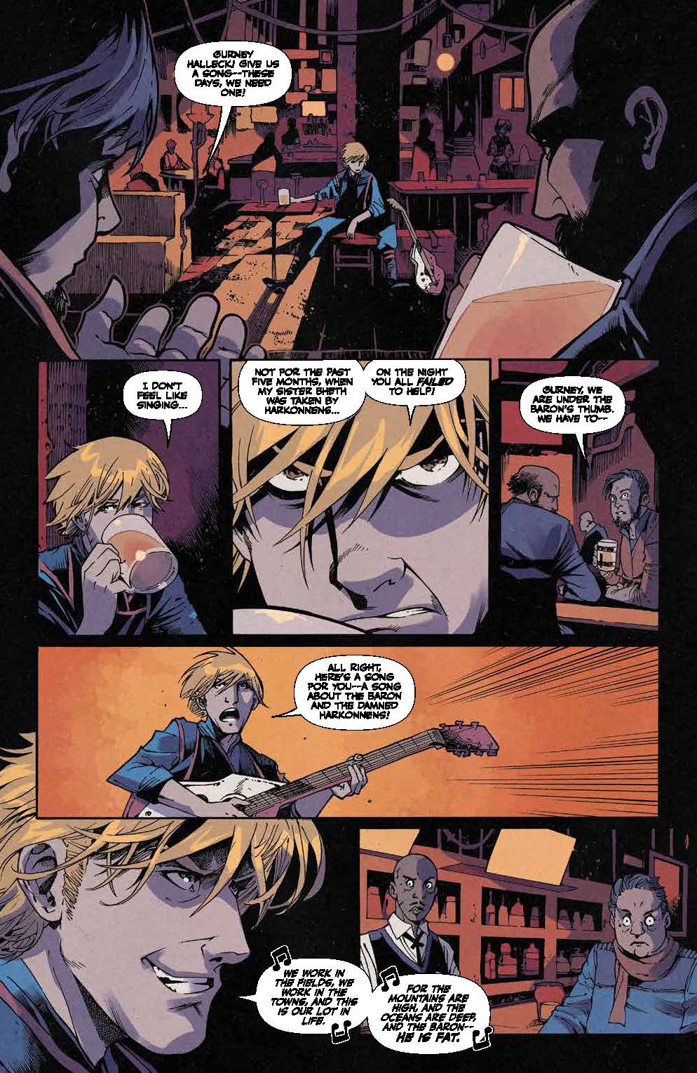 Persevering through all this political intrigue and interplanetary space-hopping is the proficient artwork of Michael Shelfer, which does a good job of packing each and every panel with as much dynamic energy as the illustrator can muster. Of particular note is the artist’s ability to imbue this comic’s extensive cast with plenty of emotional facial expressions, such as Vladimir’s aforementioned furious response to his debilitating fate, as well as the Padishah Emperor’s utter exasperation at the Tleilaxu’s unsuccessful research into a synthetic spice.
