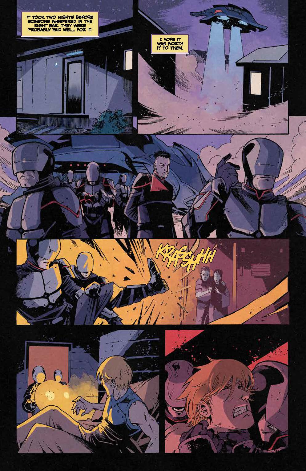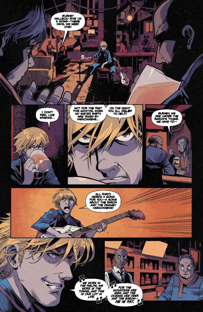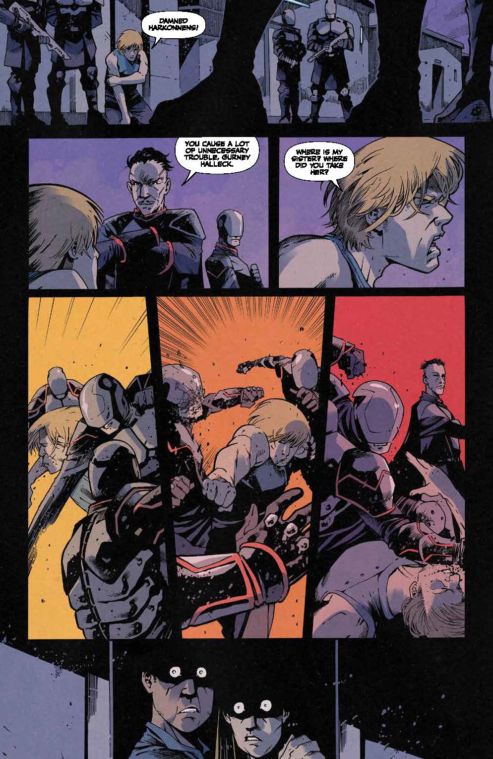Despite whisking its audience on a truly head-spinning journey from Kaitain’s Imperial Capital down to the underground city of Vernaii on the planet Ix and beyond, there’s still some opportunity to enjoy Brian Herbert and Kevin J. Anderson’s storyline for issue two of Dune: House Harkonnen whenever the collaborative partnership’s plot lingers just long enough at a single location. In fact, one of this publication’s most pulse-pounding moments comes when the tale momentarily focuses upon the former home of House Vernius and depicts a Sardaukar patrol flushing out “a nest of traitors!”