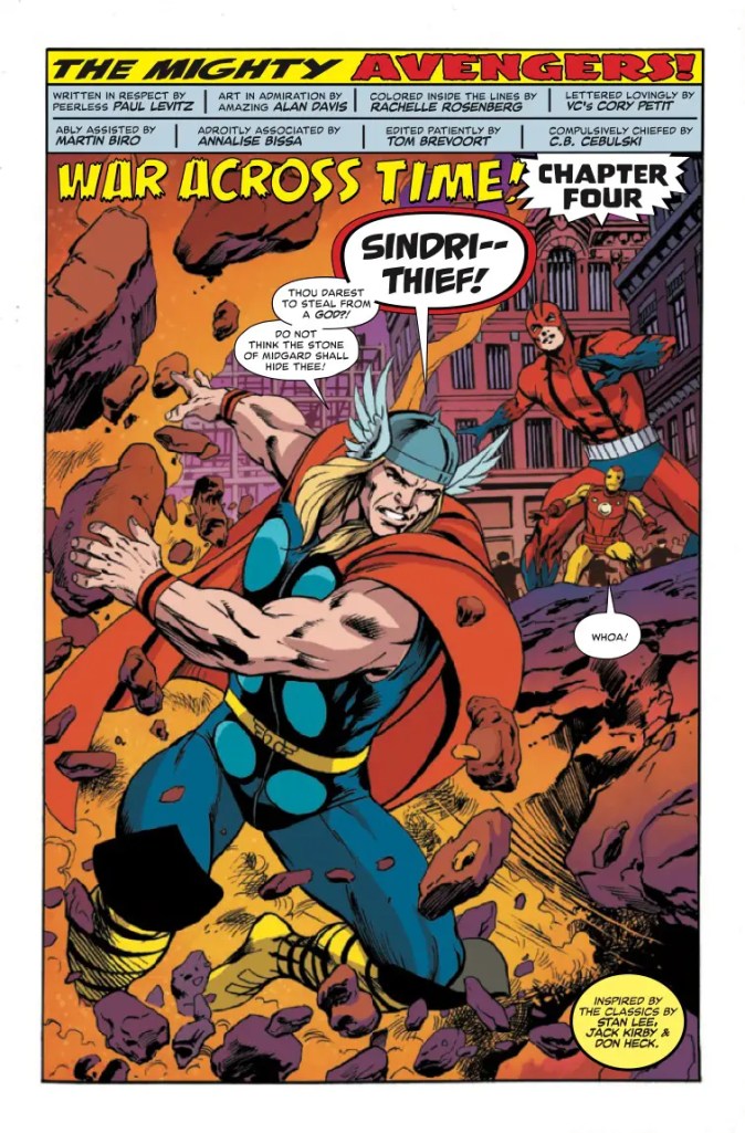 If Paul Levitz’s intention with his script for issuer four of Avengers: War Across Time was to make the King of the Dwarfs one of the most hated opponents the Earth’s Mightiest Heroes have ever faced, then he certainly succeeds. For whilst Sindri isn’t depicted as actually being evil, the self-righteous, holier-than-thou monarch is so sickeningly sanctimonious in his incorrect belief that he’s been terribly wronged by Thor, that it’s difficult to imagine any reader of this comic feeling anything but contempt for him, even after the Thunder God smacks Mjolnir’s thief into next Saturday.