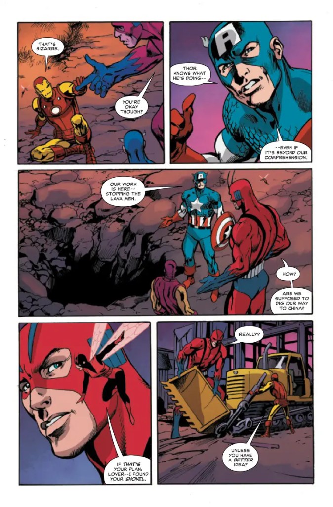 Enjoyably, Levitz also appears very good at showing his considerable cast of protagonists outthinking their foe as opposed to simply beating him around the head. This becomes particularly important once “the most powerful Avenger” departs before his vulnerable alter-ego is disastrously revealed, and the team must rely far more upon brains than brawn – most intriguingly Janet van Dyne’s; “Do you have some thermal-scanning doohickey in there? Follow the heat — I’ll bet that leads us to Sindri and the hammer!”