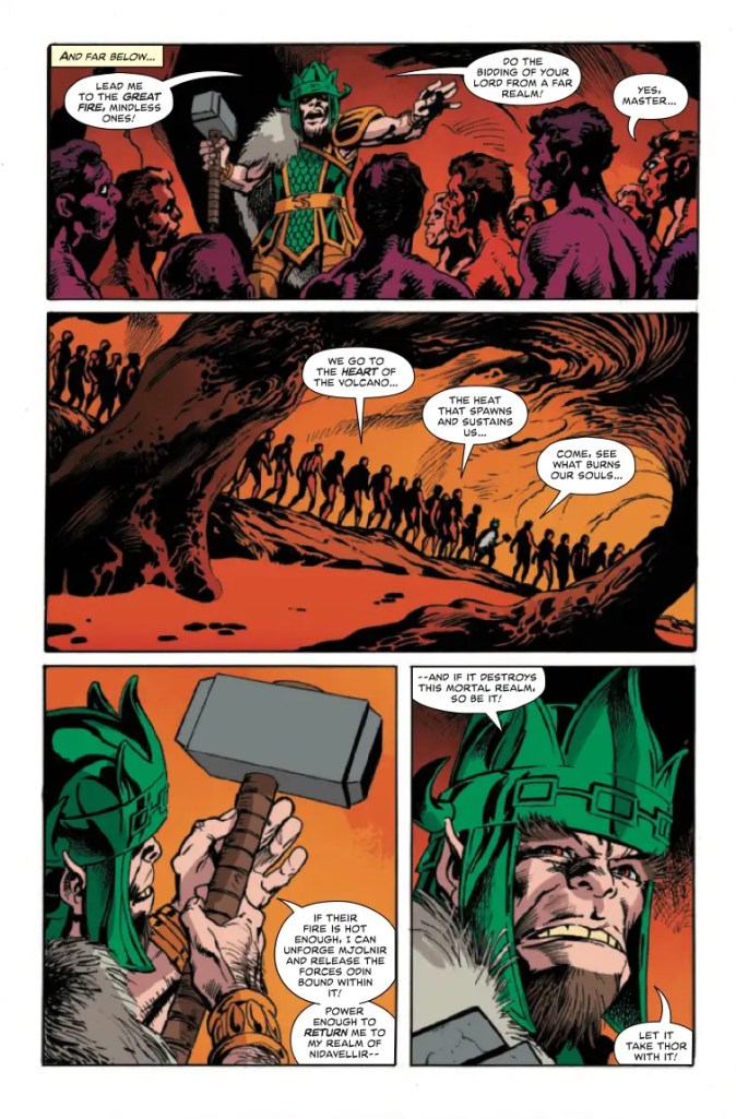 Indeed, this entire twenty-page periodical’s plot seems entirely intent upon depicting Stan Lee’s co-creation from the Sixties as nothing more than a petty-minded ruler who only thinks of manipulating the Lava Men into helping his planet-destroying revenge rather than searching for the actual truth behind his present predicament on Midgard. Sure, this book also portrays Kang the Conqueror as a leveller of civilisations and cold-hearted killer of his own subjects, but the time-travelling entity is in many ways simply a power-seeking super-villain who callously guns down one man for speaking to him with “impunity”. Whereas Sindri is willing to unjustly sentence an entire population to a “fiery doom” just because he mistakenly assumes Odinson has transported him from Nidavellir against his will.