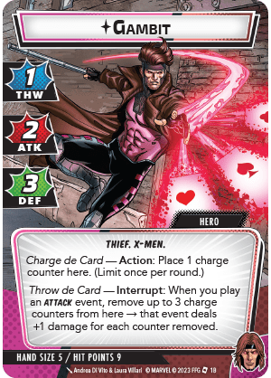 Gambit is a bit more of a finesse character. Whilst I don’t want to literally throw the cards (Chaos Orb, this ain’t), I would like to have seen more discard / cycling options rather than just charge tokens. Ironically, it’s his (very good) alter-ego that does more of this, using them to remove threat. I really like that we’re getting more cards for Justice/Spy decks (hello, Natasha), although Thwart 1 on a Justice-driven character feels a bit odd.