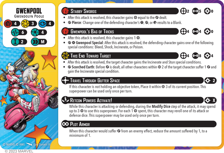 Gwenpool is good… just not great. She’s incredibly vanilla, especially for 4 threat. Solid numbers, a builder, a reroll, a teleport, a condition disher, a damage reducer… she’s… fine.