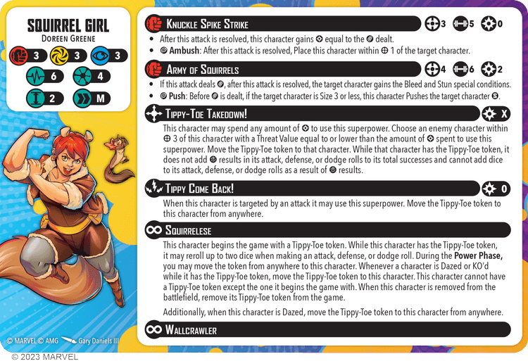 A R3 S5 builder from the outset is pretty bloomin’ nasty – but with a jump move to the opponent on a Wild? Spicy. But the real craziness starts with tiny Tippy-toe, costing power equal to the target’s threat and negating their ability to use Crits. Pesky Squirrels!
