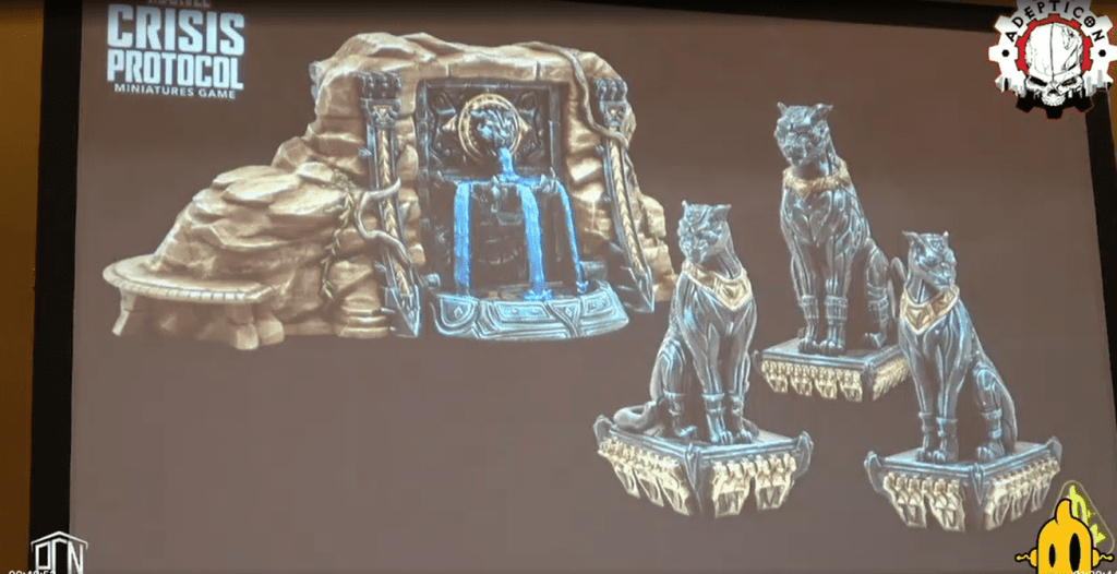From Atomic Mass: “New Wakandan Terrain with optional game rules for the terrain. These will affect threat level for missions and add flare and flavor. Includes a Vibranium Hauler with doors that can fold open and closed and vibranium canisters that affect the gameplay using the optional terrain rules.”