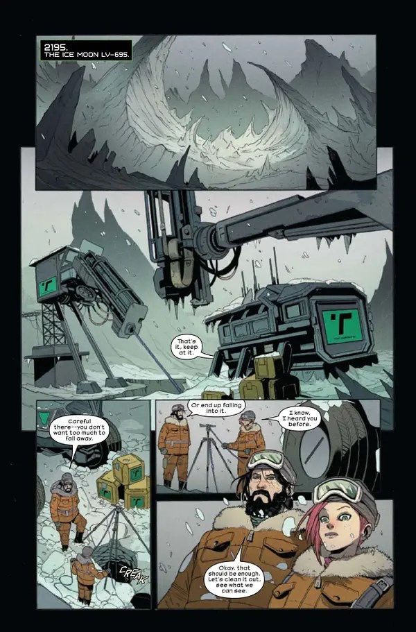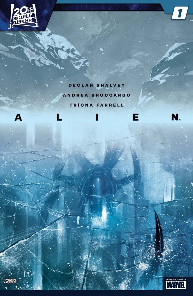 For this year’s Alien Day, Marvel have launched a brand new Alien series from Declan Shalvey and Andrea Broccardo as part of their 20th Century Studios imprint. This first issue takes us to LV-695, in ice-covered moon which serves as the site for some pioneering water conversation research by scientist Batya Zahn and her family. Thing is, the heavily-pregnant Batya has had just about enough of being stuck in the cold isolation, and when her daughter makes an unexpected discovery during a routine excavation, she sees it as her ticket home and immediately calls it in.