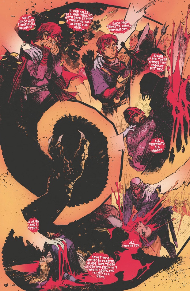 Introducing such a large cast of characters in a short space of time is always going to be a tall order. Instead of being able to get a feel for these individual characters, we have to settle for snippets of what they’re doing before being ‘summoned’ and as such, I feel forced into distilling everyone into a simple descriptor or pairing; the angry gun guy, unhinged Russian, the couple, the twins, the delightfully creepy homunculus. It’s a conceit, but one I can forgive to save this from falling into drudging, plodding exposition. Instead, we know all we need to at this point in time, with enough hooks in the writing, and stylings in the artwork to give the characters some degree of memorability.